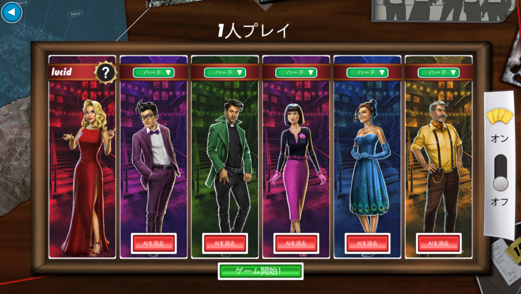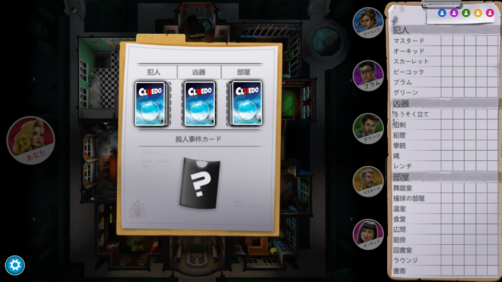 この選ばれた「犯人」「凶器」「部屋」を当てることが勝利条件となります。