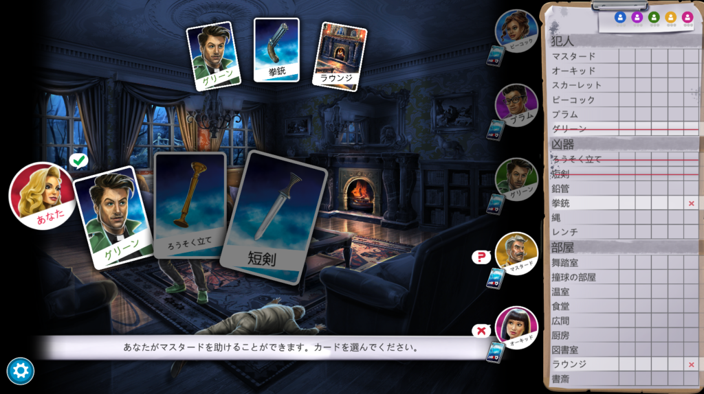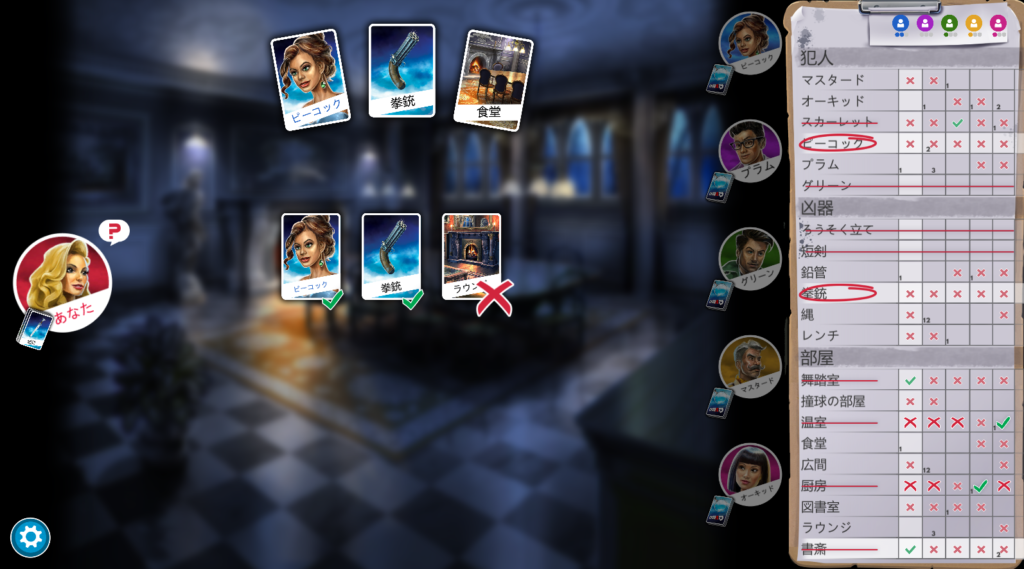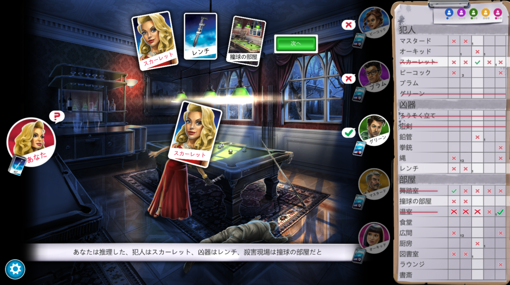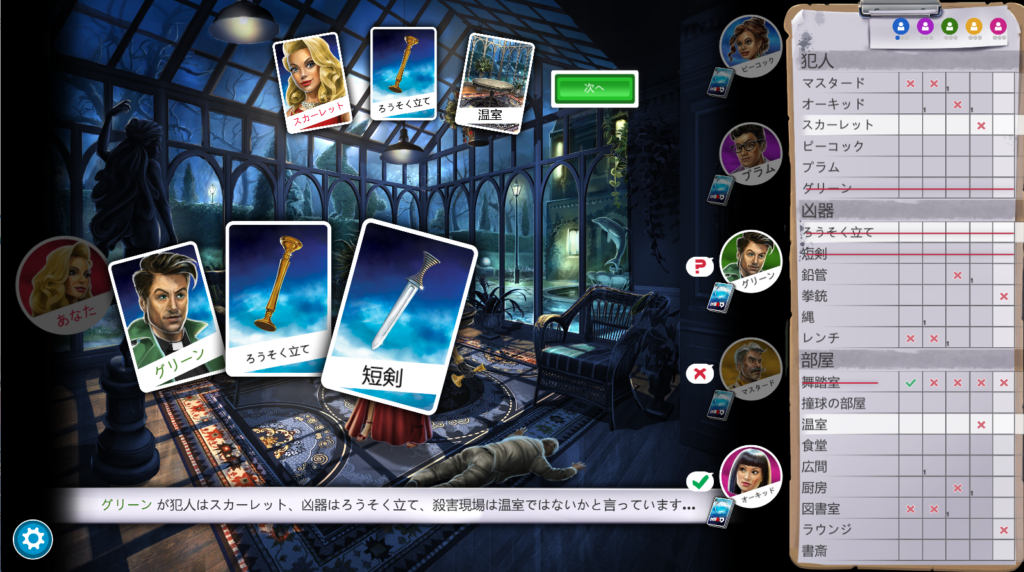 2枚目の画像はゲームが進み、私が質問してグリーンが「スカーレット」のカードを持っていると答えた場面です。