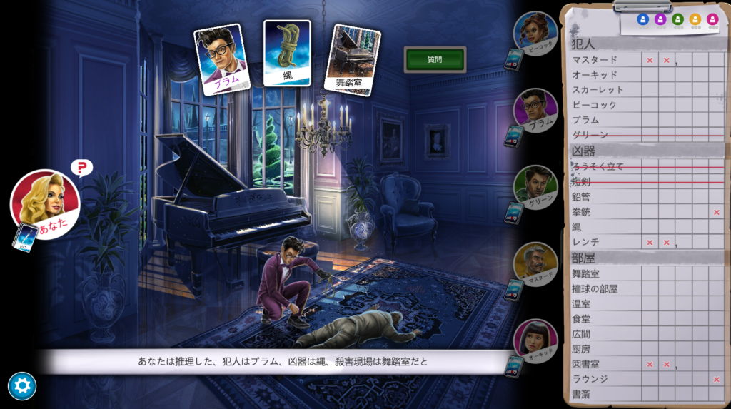 1枚目はグリーンが「スカーレット」「ろうそく立て」「温室」のカードについて質問し、オーキッドがいずれかのカードを持っていることがわかりました。