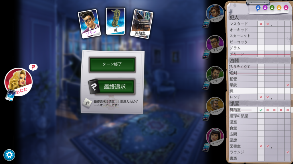 自分の手番で質問が終了すると、そのままターンを終了するか、最終追求をするか選べます。